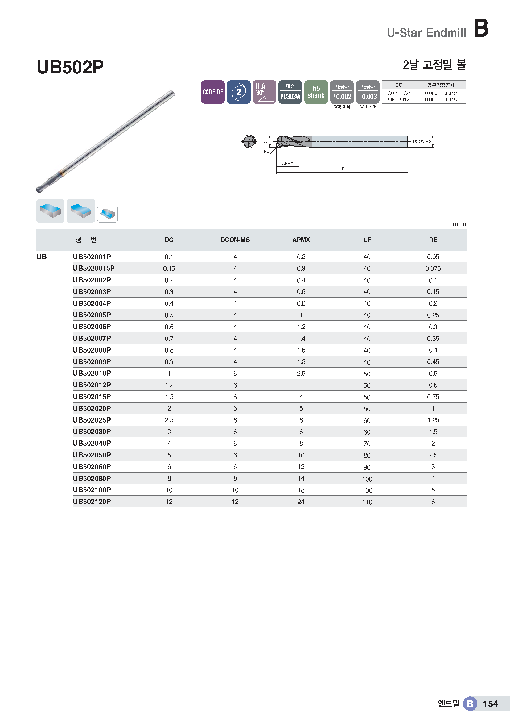 2날 범용 볼 엔드밀(고정도) UB502..P/ KR