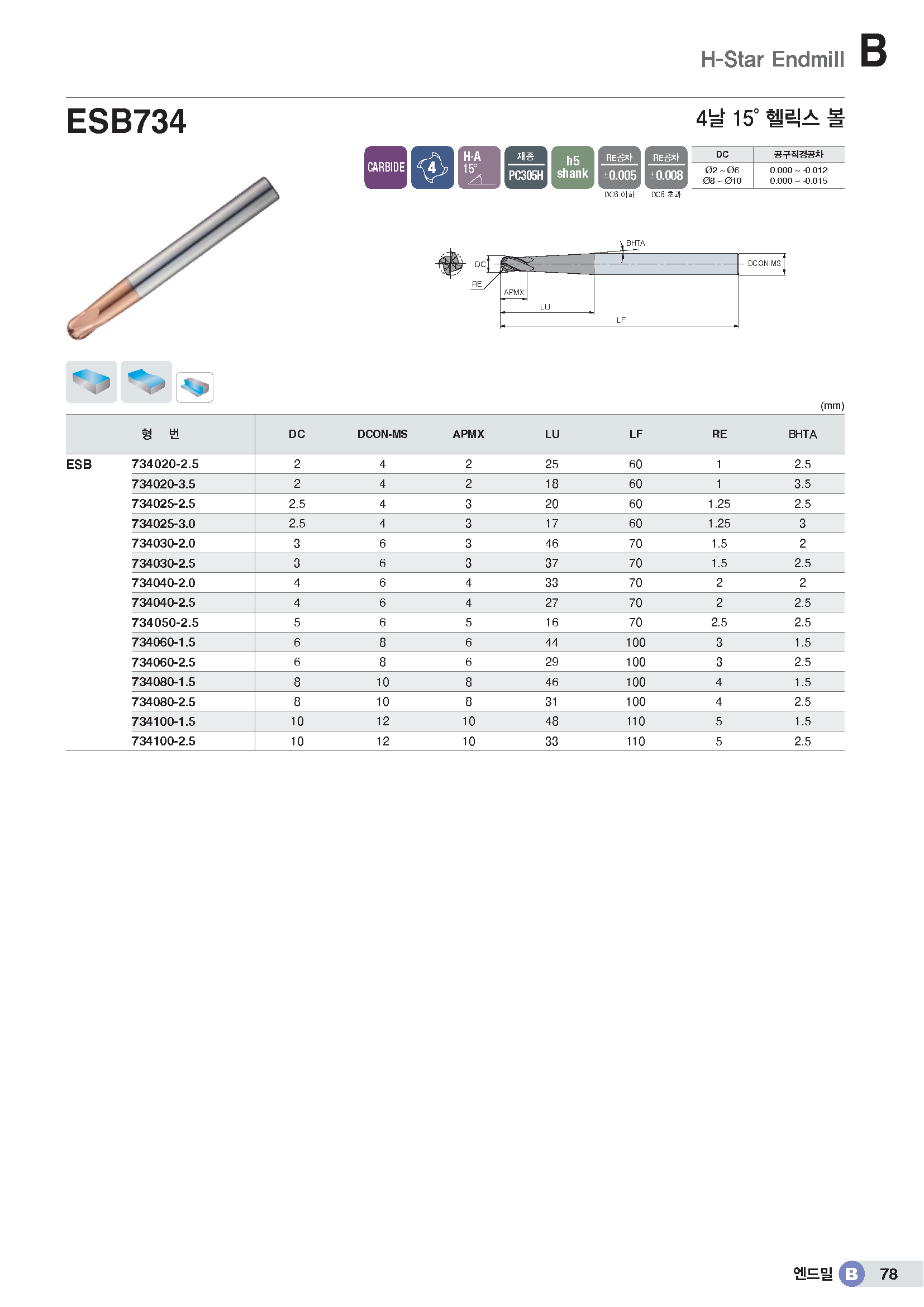 4날 고경도용 볼 엔드밀(H15°,테이퍼-넥) ESB734../ KR