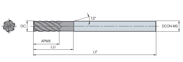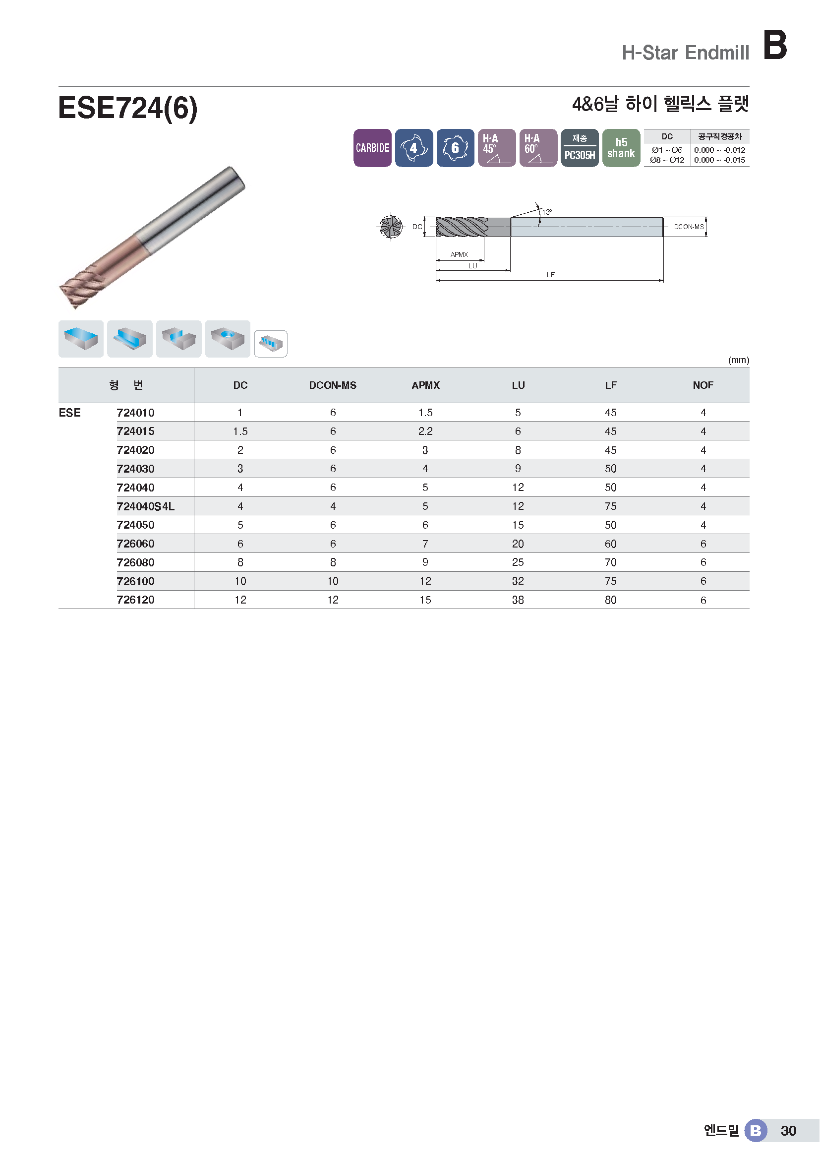 4날 고경도용 플렛 엔드밀(H45°,넥-타입) ESE724../ KR