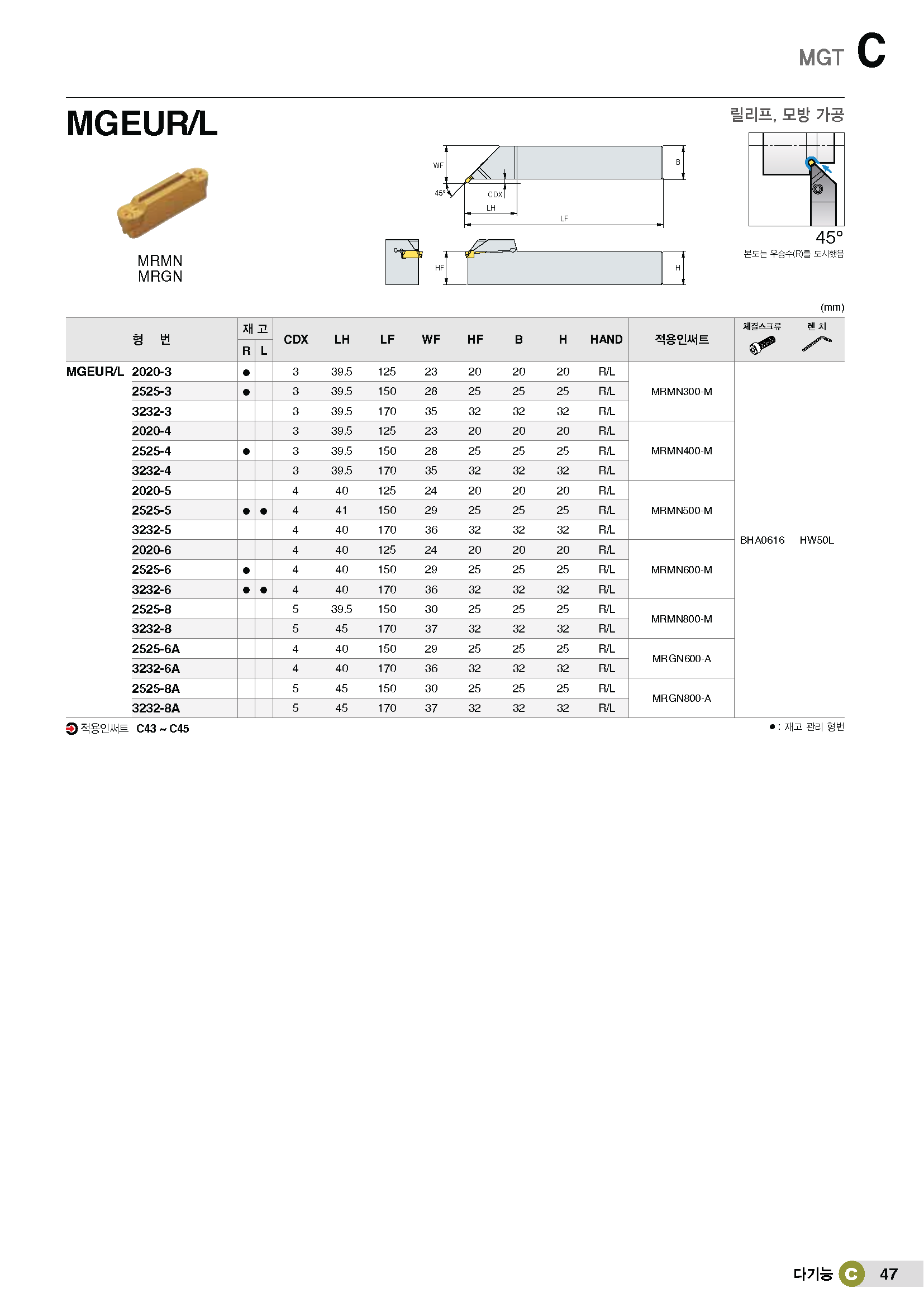 외경 릴리프 홈가공 홀더(2코너)/ MGEUR../ KR