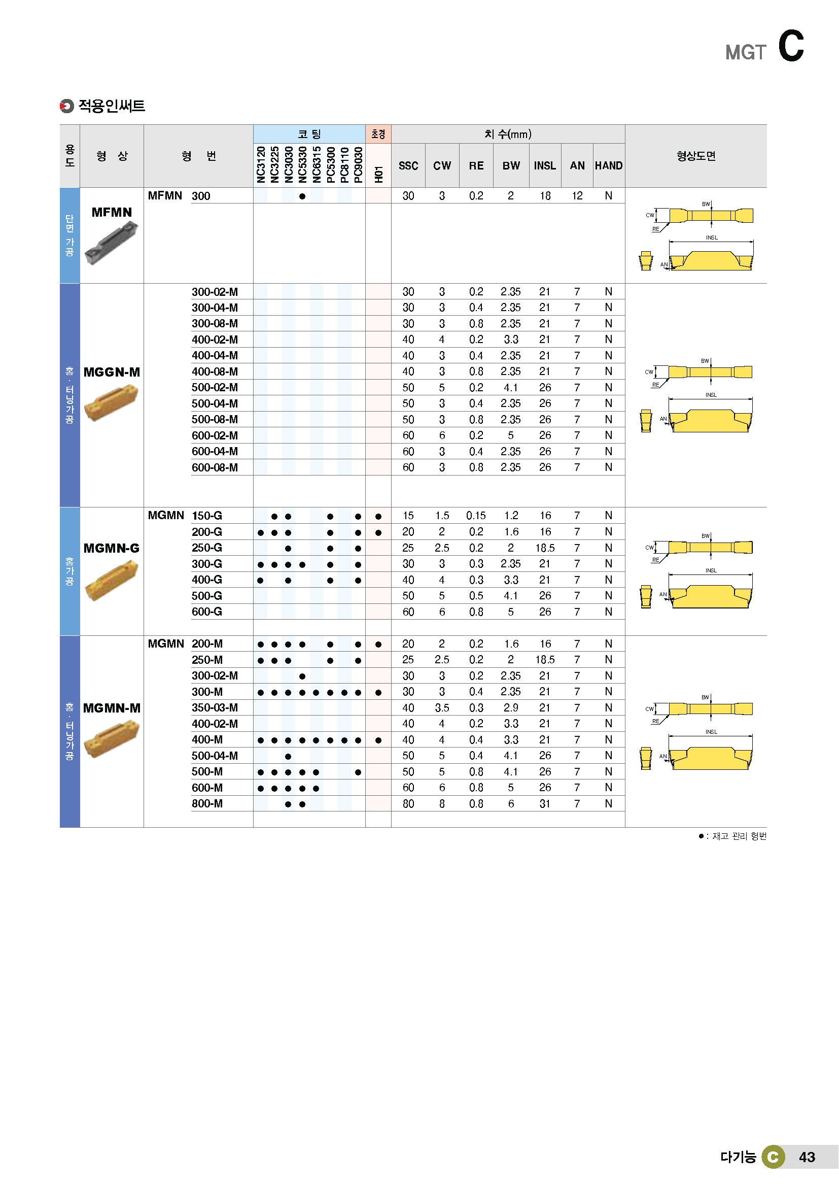 • 상품명 MGT 홈가공 인써트/ MG□□□..-3../인선 보강형 /강용